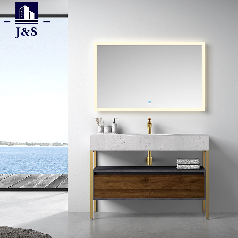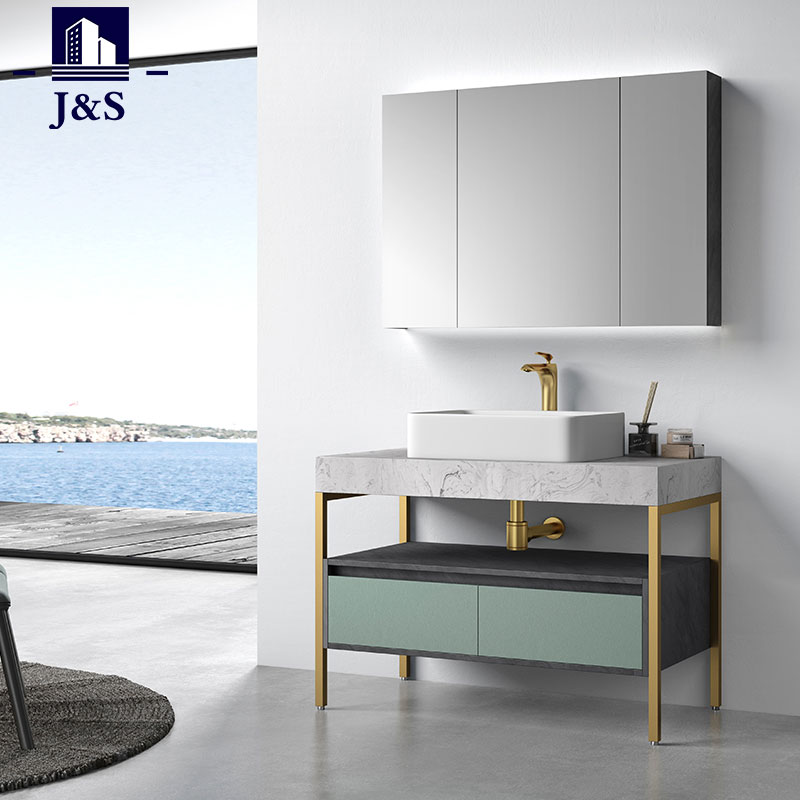 Dodáváme špičkové moderní koupelnové skříňky. Tato koupelnová skříňka má moderní design. Základní jednotka s otevřenými policemi s mramorovým umyvadlem, čtvercové zrcadlové skříňky poskytují úložný prostor a udělají v místnosti pořádek.