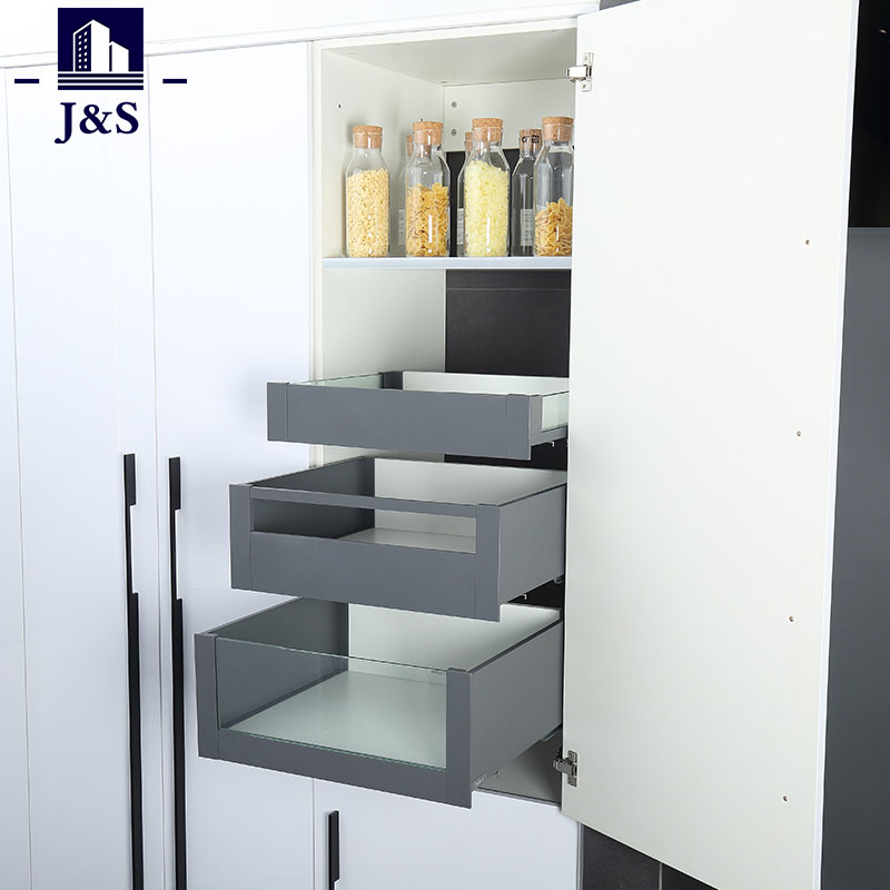 Kuchyňská vložka Slow Motion Drawer Soft Close Slides Tandem Box je třívrstvá ocelová bočnice se zabudovaným tlumením, známá také jako luxusní tlumení pumping. Jedná se o nejlepší hardwarový doplněk používaný v celé kuchyni, šatní skříni, zásuvce atd. it je pevnější a odolnější než třídílná vodicí lišta.